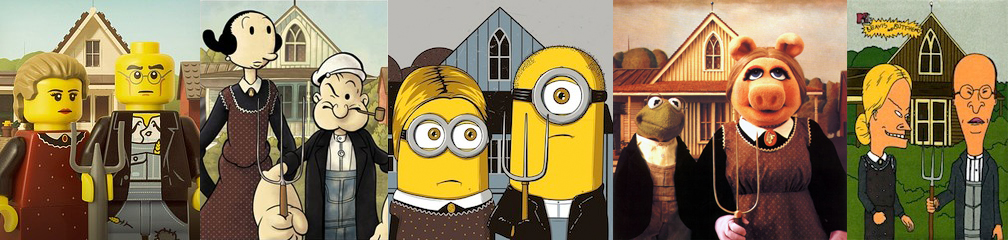The painting endures, Biel concludes, because it is both itself and a parody of itself. Its meaning has more to do with the viewer’s perception than Wood’s intention. In this, Biel is identifying something common to all visual material. Paintings (like films) never change, but they are subject to differing responses and interpretations as times change. Those that survive cultural, aesthetic and historical shifts share the characteristics that can be seen in ”American Gothic.” It’s simple — two people and a house — and easily remembered. It’s ambiguous and thus can evoke the ambivalent. Wood’s choice of clothing, hairstyle, color and sober posture denies specifics, yet suggests a time, a place and an attitude. It opens the door to popularity (anyone can enjoy it for any reason); argument (does it criticize Middle America or affirm its values?); hatred (it’s an ugly cliché and she’s got rickrack on her dress); parody (the Barbie and Ken or Mickey and Minnie Mouse versions); rebellion (Gordon Parks’s photograph of a black cleaning woman uses the pose to remind us of its basic whiteness); commerce (Paul Newman and his daughter posing on their organic snack packages); politics (representations of a long line of American presidents and their first ladies); and endless pop cultural references (the small-town tableau of ”The Music Man” or the credits for ”Green Acres”)