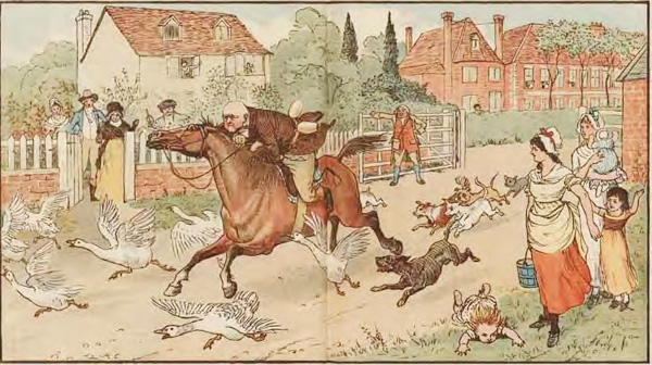 The full-color illustration adapted for the image depicted on the Caldecott Medal, from The Diverting History of John Gilpin (1878). Source: http://www.publishersweekly.com/images/data/ARTICLE_PHOTO/photo/000/017/17815-1.JPG
