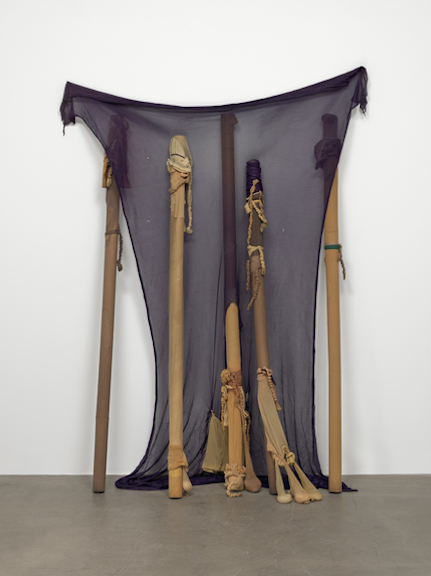 Untitled / 1976 / Nylon, pantyhose, sand, and cardboard roll / 72”x53”x17″