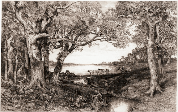Under the Oaks-Georgica Pond / 1887 / Etching on parchment paper / 25 5/8”x37 1/2”