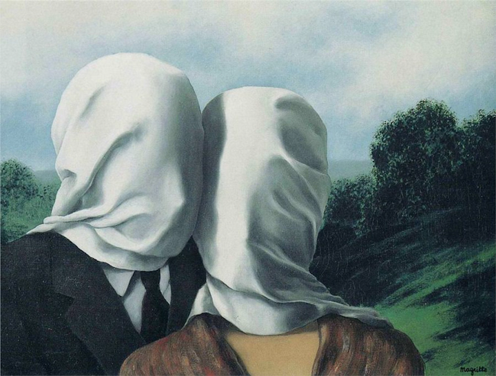 Enshrouded faces were a common motif in Magritte’s art. The artist was 14 when his mother committed suicide by drowning. He witnessed her body being fished from the water, her wet nightgown wrapped around her face. Some have speculated that this trauma inspired a series of works in which Magritte obscured his subjects’ faces. Magritte disagreed with such interpretations, denying any relation between his paintings and his mother’s death. “My painting is visible images which conceal nothing,” he wrote, “they evoke mystery and, indeed, when one sees one of my pictures, one asks oneself this simple question, ‘What does it mean?’ It does not mean anything, because mystery means nothing either, it is unknowable.”