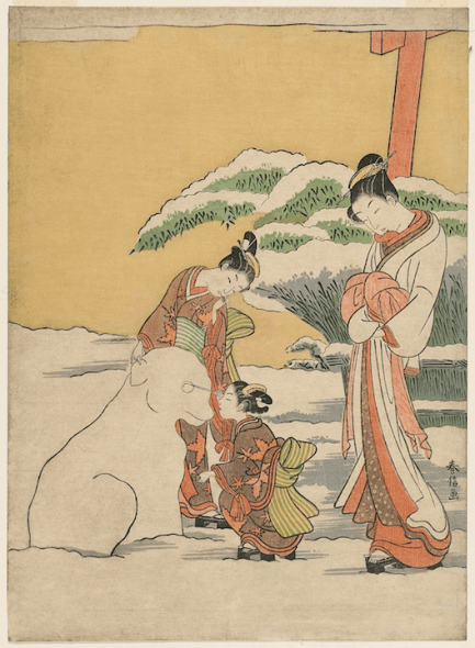 Courtesan Watching Two Kamuro Make a Snow Dog by Suzuki Harunobu