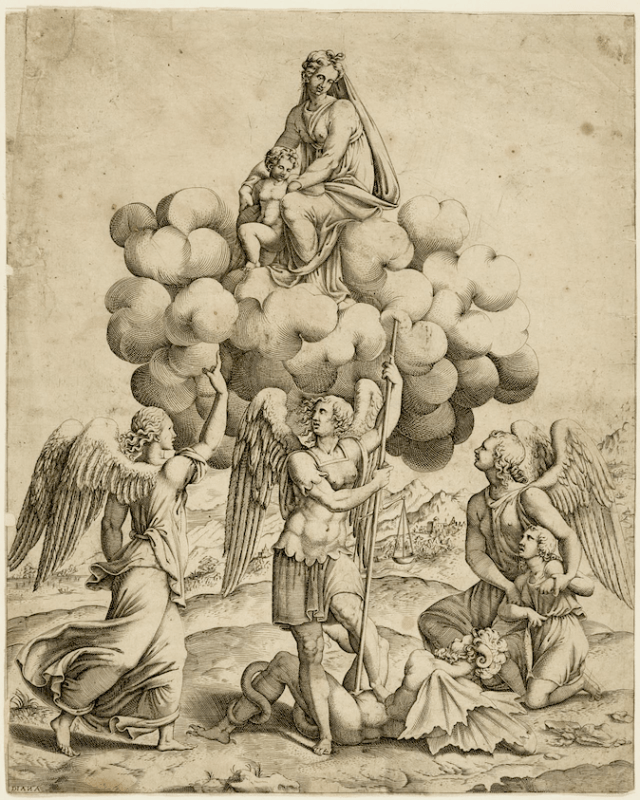 The Archangels Michael, Gabriel, and Raphael Adoring the Madonna and Child