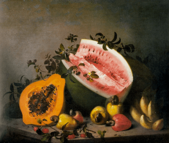 17Dec2020 December is Root Vegetables and Exotic Fruits Month! #17 Posted in December is Root Vegetables and Exotic Fruits Month! by Christy Papaya and Watermelon by Agostinho da Mota 1860 / Oil on canvas / 21″x25 1/2″ / Museu Nacional de Belas Artes, Rio de Janeiro, Brazil [There are three embedded links above] Share this: Click to share on Facebook (Opens in new window) Facebook Click to share on X (Opens in new window) X Click to share on Pinterest (Opens in new window) Pinterest Like Loading...
