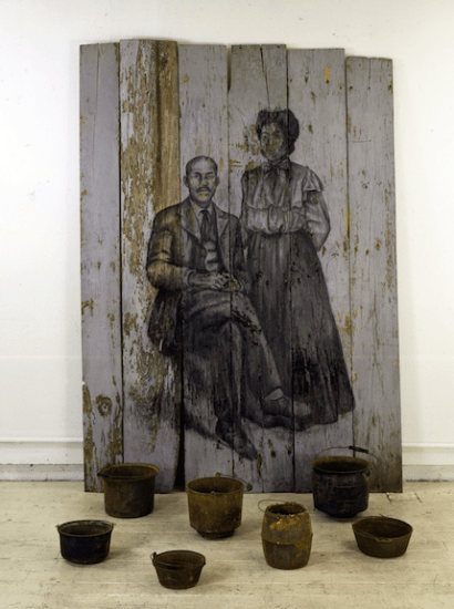 Still / 1999 / Charcoal on wood, found objects / 96”x68”x48”
