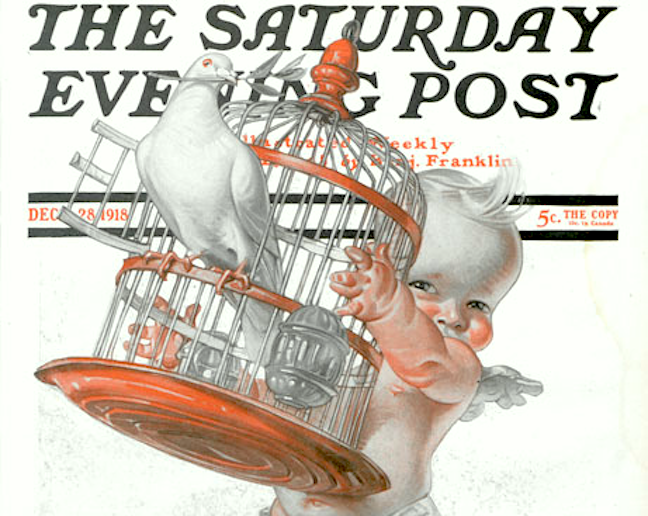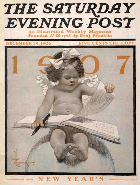 His first baby was delivered for the December 29, 1906, issue of the Post. It shows a cherub atop a globe, turning over a fresh page in a book of New Year’s resolutions. The series continue without interruption until 1943…”
