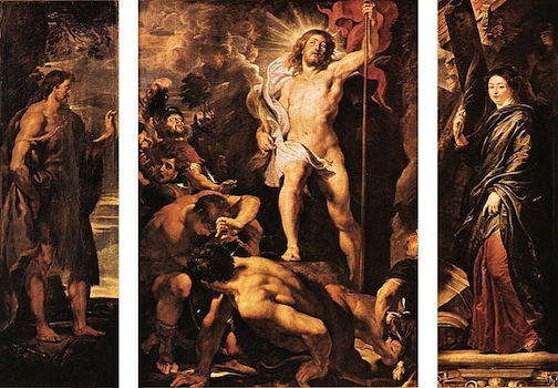 Christians celebrate the resurrection of Jesus on Easter Sunday, two days after Good Friday, the day of his crucifixion. It is the central tenet of Christian theology. The Resurrection of Christ has been portrayed by artists for 2,000 years; I thought it would be appropriate at Easter to take an (obviously lightning fast) overview of how some painters have depicted it. (Click image to enlarge).