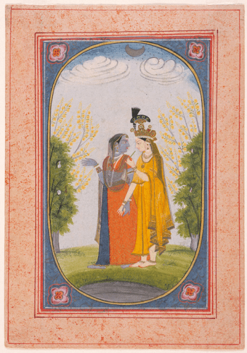 In many paintings (2003.178a), the divine couple is presented within a fertile, flowering landscape filled with pairs of birds. ~ https://www.metmuseum.org/toah/hd/rajp/hd_rajp.htm