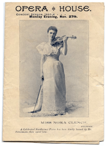 Leonora Clench in what is now Ontario, Canada. Nora made her debut as a violinist at the age of 8. When she was fifteen she entered the Leipzig Conservatory in Germany, and after graduating in 1889 she became first violinist and leader of an orchestra in Buffalo, New York. She later toured Europe and eventually moved to London. • In 1900 Clench temporarily gave